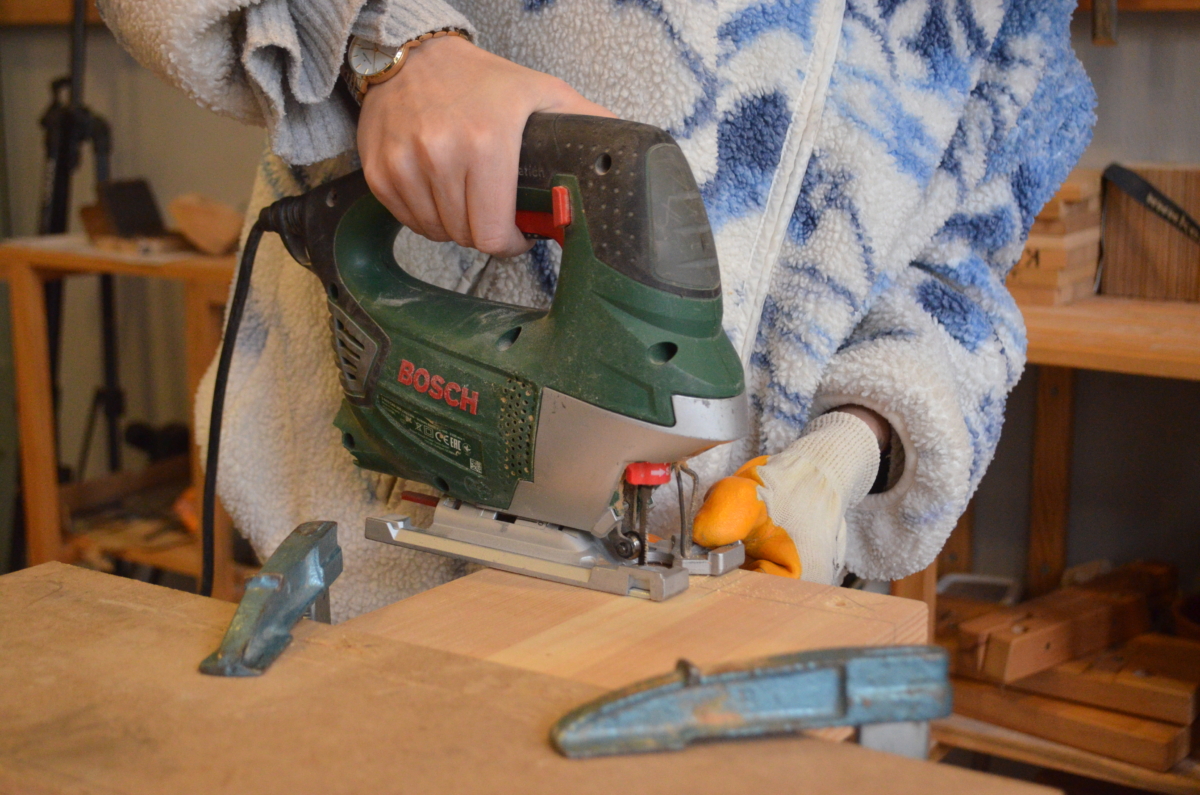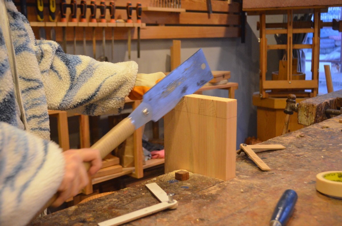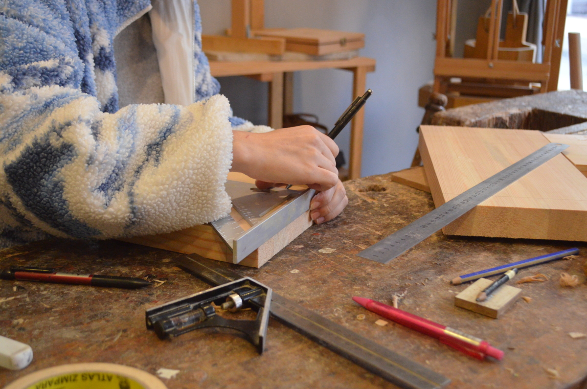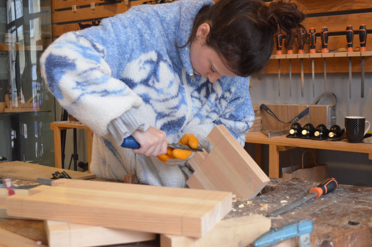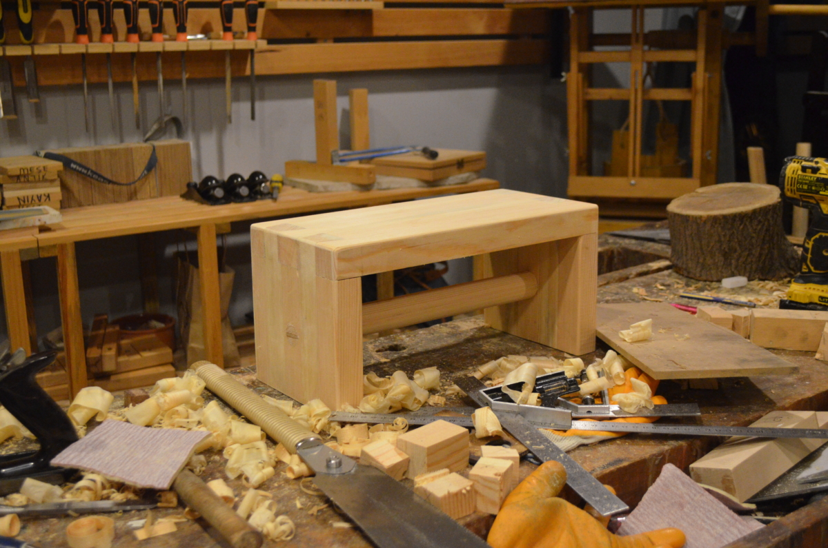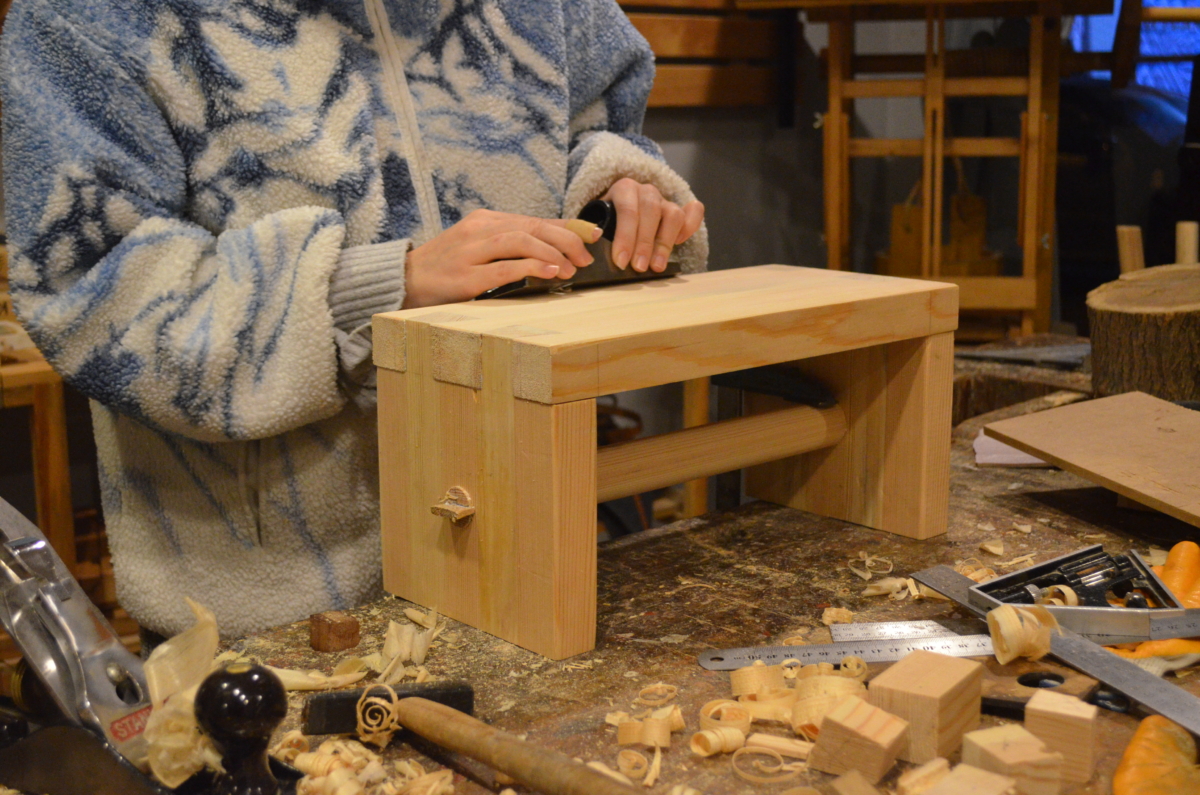 Aralık ayında düzenlediğimiz Marangozluk Atölyesi’nde marangoz tezgahı ve el aletlerini kullanarak bir ürünün tasarım ve üretim aşamalarını uygulamalı olarak öğrendik. Birinci gün 4 saat teorik-pratik anlatım ve tasarım çalışması yapıp, 4 saat basamağımıza kırlangıç diş açtık. İkinci gün ise 8 saat açmış olduğumuz dişlerin karşılıklarını çalıştık. Basamağın destek çıtasının karşılığına zıvana açtık. Son olarak yüzeylerimizi takıp kamalarımızı çaktık. Yüzeydeki fazlalıkları alıp son yüzey işlemleri ile tasarımımızı tamamladık.
